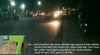 HN-Lholseumawe-Tiga sepmor bertabrakan di Jalan Umum Medan – Banda Aceh Desa Ulee Madon Kecamatan Muara Batu Kabupaten Aceh Utara dan mengakibatkan seorang korban meninggal dunia, Jumat 06 April 2018 pukul 21.00 Wib.