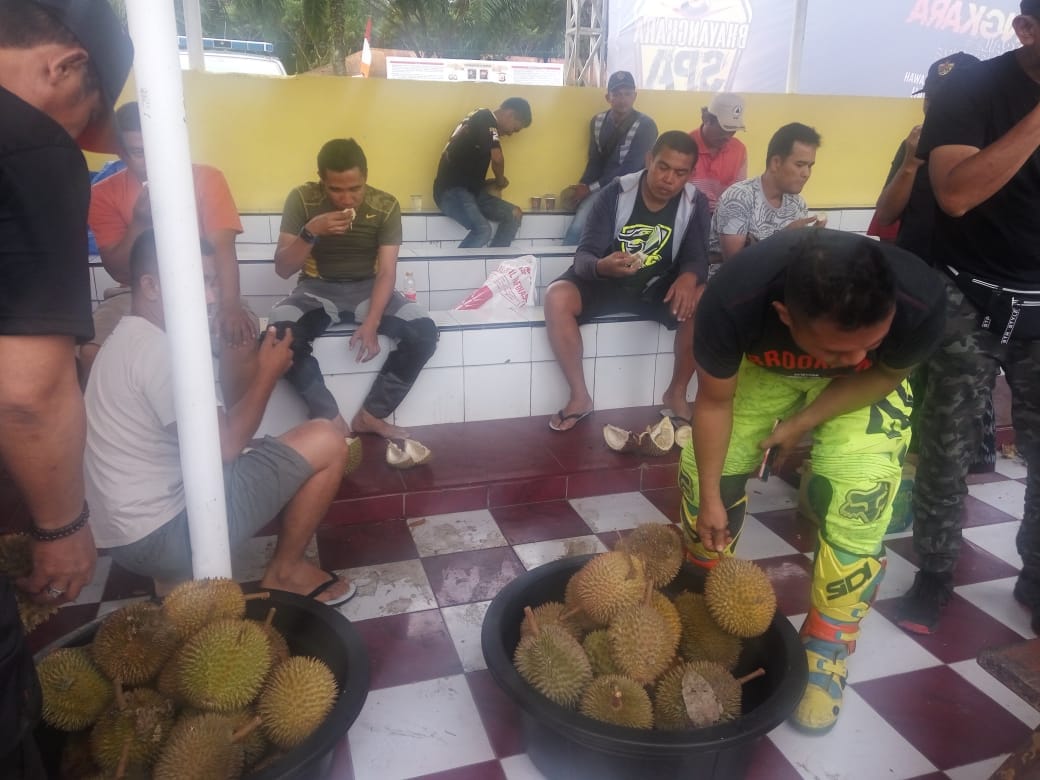 HN-Aceh Besar, Even Bhayangkara Seulawah Private Adventure (SPA) 2 Trail Adventure berakhir dengan pesta durian. Pesta durian ini diikuti oleh seluruh peserta yang terlibat, termasuk ratusan rider di SPN Seulawah Polda Aceh, Minggu (29/7/2018) sore.