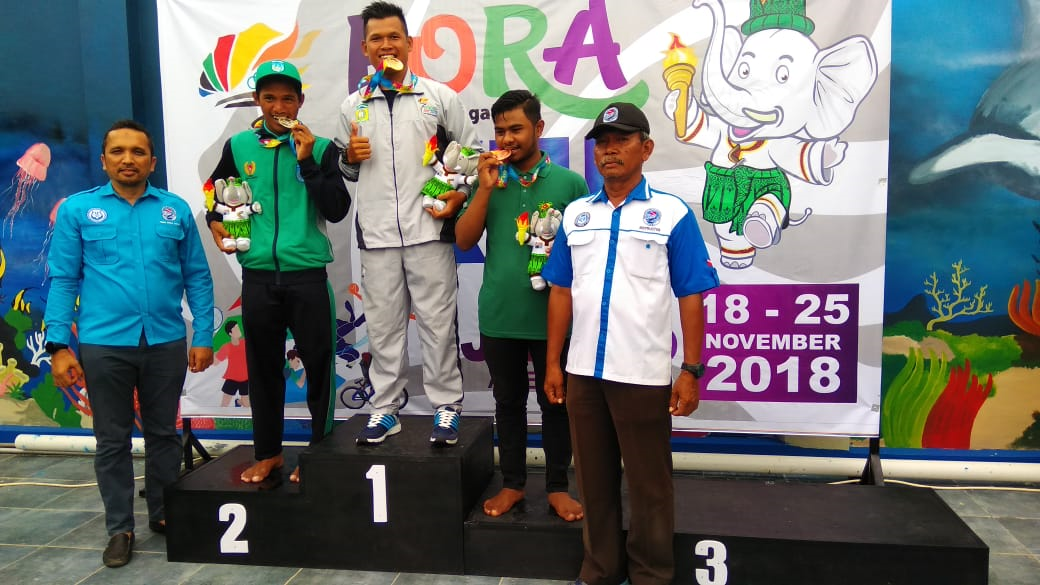 Kedua Emas tersebut masing-masing diraih oleh tuan rumah Aceh Besar yang pertama nama Eka Resdianto dari nomor Bifins 50 meter Putra dan emas yang kedua diraih oleh tim beregu dengan nomor estafet 4 x 100 putra atas nama Eka Resdianto, Abed Nego Purba, Galeh Presetyo dan Radiansyah Putra.