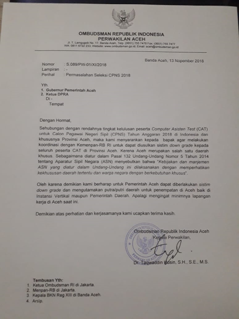 Surat yang ditandatangani langsung oleh Dr. Taqwaddin Husin selaku Kepala Ombudsman Perwakilan Aceh tersebut menyarankan agar Gubernur Aceh dan DPRA melakukan koordinasi dengan Menteri Pemberdayaan Aparatur Sipil Negara dan Reformasi Birokrasi Republik Indonesia (Menpan-RB) untuk proses penurunan nilai ambang batas atau down grade nilai Computer Asisten Tes (CAT) dari yang telah ditentukan.