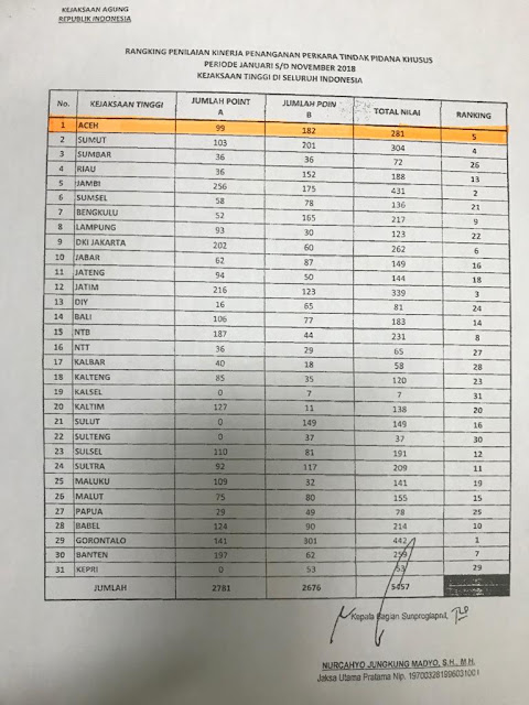 Capaian prestasi yang dinilai oleh Jaksa Agung Muda Pidana Khusus, periode Januari sampai dengan November 2018 menempatkan kinerja Kejati Aceh Bidang Pidsus pada rangking ke 5 nasional dari 31 Kejati se Indonesia yang dinilai.