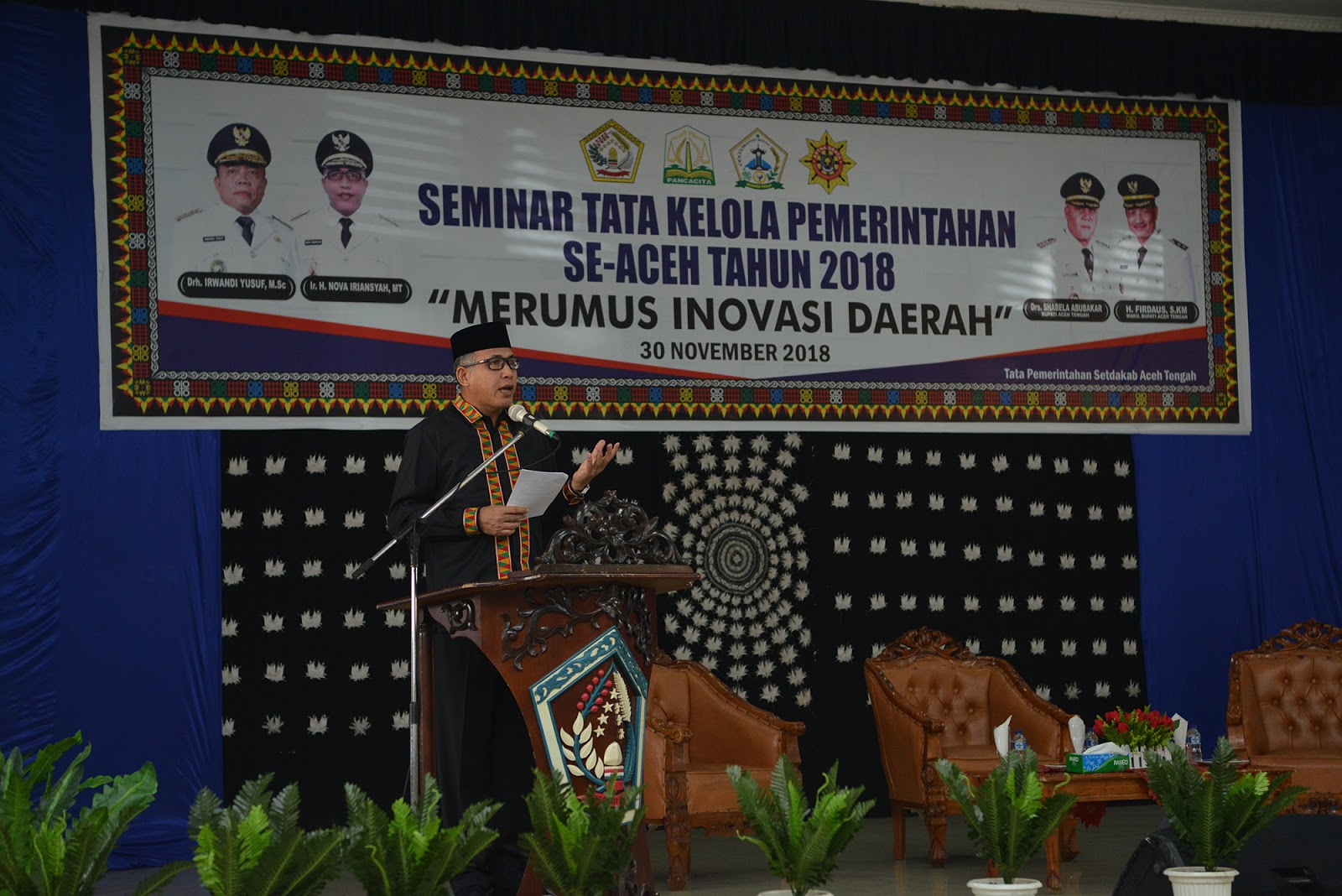 HN-Banda Aceh – Pelaksana Tugas Gubernur Aceh, Nova Iriansyah menyampaikan arah pembangunan strategis Aceh dalam seminar tata kelola pemerintahan tahun 2018, di Gedung Olah Seni Takengon Aceh Tengah, Jumat 30/11/2018. Salah satu arah pembangunan itu adalah pembangunan reformasi birokrasi, serta peningkatan tatakelola dan pelayanan publik. Di mana, tata kelola pemerintahan merupakan sesuatu yang harus didukung dengan intelegensi tinggi dan beritegritas.