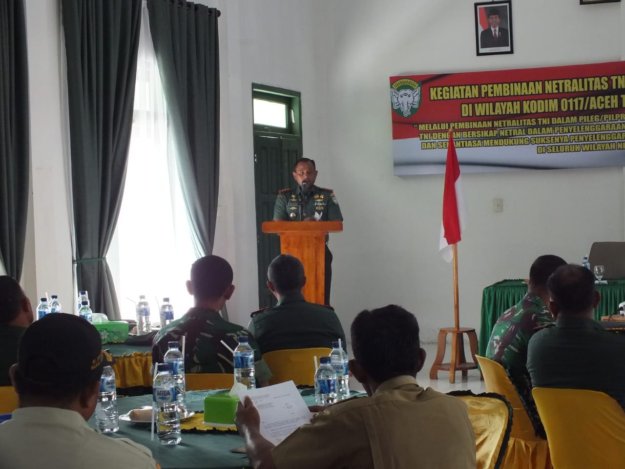 ACEH TAMIANG — Mewujudkan Profesionalisme TNI dengan bersikap Netral dalam penyelenggaraan Pemilu baik Pileg maupun Pilpres Kodim 0117/Atam mengelar acara kegiatan Pembinaan Netralitas TNI dalam Pileg/Pilpres 2019 di wilayah Kodim 0117/Atam TA. 2019, bertempat di Aula Makodim 0117/Atam Kecamatan Kejuruan Muda Aceh Tamiang, Senin (25/2/2019).