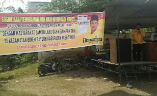 HN, Aceh Timur- Kelompok petani di Birem Bayeun, Aceh Timur sampaikan dukungan kepada Abd Hadi Abidin Calon anggota DPRA dapil Aceh Timur, nomor urut 1 dari partai golkar. hal itu, di sampaikan mereka, saat Abd Hadi Abidin temu ramah dengan para petani Se-kecamatan Birem Bayeun dan sejumlah masyarakat di Desa Jambo Labu, Birem Bayeun, Aceh Timur, Rabu (03/04/2019).
