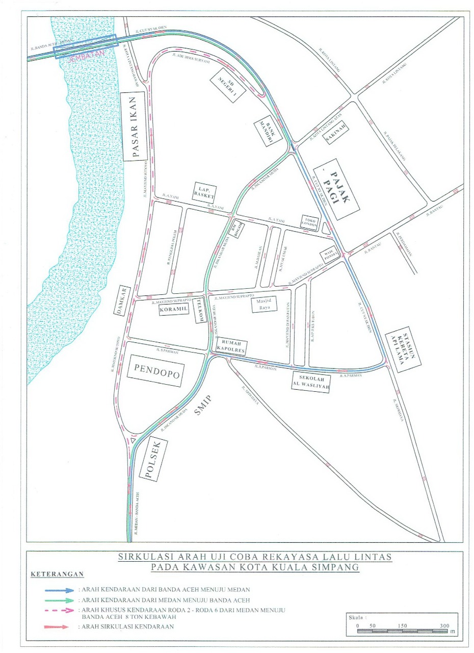 Adapun uji coba arus lalu lintas yang akan dilakukan nanti, Jika berkendara dari Banda Aceh setelah tiba jembatan sungai tamiang sebelumnya belok ke arah kanan menuju medan, berubah lurus menuju jalan Cut Nyak Dhien lewat di depan Pasar Pagi, terus ke arah bekas Stasiun Kereta Api, kemudian berbelok ke kanan memasuki ke Jalan S.Parman, hingga perempatan Rumah Dinas Kapolres kemudian berbelok ke arah kiri memasuki jalan Iskandar Muda.
