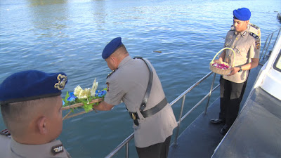HN-Banda Aceh, Menyambut Hari Bhayangkara ke 73 Tahun 2019, Dirpol Airud polda Aceh Kombes Pol. Jemmy Rosdiantoro, S. S.,T. M. K., S. H, memimpin sekaligus menjadi Irup pada upacara tabur bunga di sungai depan Mako Ditpol Airud, Lampulo, Banda Aceh.