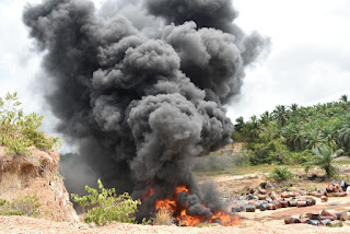 Pemusnahan dengan cara dibakar yang sebelumnya dibuat kubangan dengan diameter lebih kurang 30 meter dengan kedalaman sekira 8 (delapan) meter selanjutnya minyak mentah dituang ke dalam kubangan tersebut untuk dibakar.