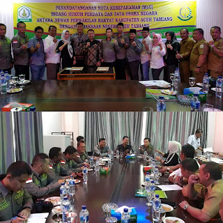 Aceh Tamiang — Mengoptimalkan pelaksanaan tugas dan terkait dibidang Hukum Perdata dan Tata Usaha Negara Dewan Perwakilan Rakyat Kabupaten (DPRK) Aceh Tamiang bersama Kejaksaan Negeri (Kejari) Aceh Tamiang melakukan penandatanganan Memorandum Of Understanding (MOU), bertempat di Gedung DPRK Aceg Tamiang kecamatan Karang Baru, Selasa (20/08).