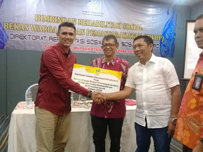 Habanusantara.com BANDA ACEH– Sebanyak 16 orang bekas warga binaan pemasyarakatan atau eks Nara Pidana Teroris (Napiter) mendapat bantuan sosial dari Kementerian Sosial RI tahun anggaran 2019. Penyerahan Bantuan Ekonomi Produktif (UEP) tersebut diserahkan langsung oleh Direktur Rehabilitasi Sosial Tuna Sosial dan Korban Perdagangan Orang (RSTS & KPO), Waskito Budi Kusumo yang diterima secara simbolis oleh ketua Yayasan Jalin Perdamaian serta disaksikan oleh Kepala Dinas Sosial Aceh Drs. Alhudri, MM serta Kepala Bidang Rehsos Isnandar,A.KS, M.Si, kegiatan tersebut berlangsung di hotel Kryad Muraya Hotel Aceh.
