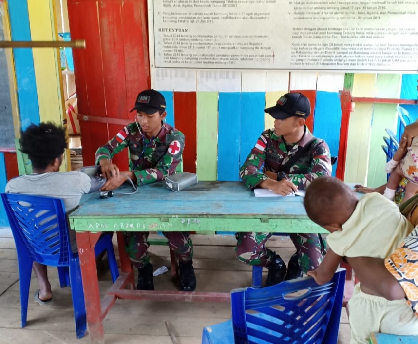 Yonif Raider 509 Kostrad Pos Tatakra yang di Pimpin Letda Heriyansyah Purba Melaksanakan Kegiatan pelayanan kesehatan Pengobatan gratis dan imunisasi Balita kepada warga Masyarakat Di perbatasan RI-PNG di Kampung Tatakra.