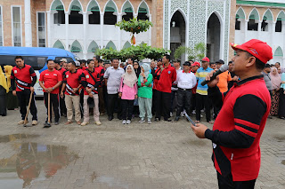 Sebelum gotong royong dilaksanakan, terlebih dulu Sekretaris Daerah Aceh Timur. H.M.Ikhsan Ahyat, S.STP.M.AP mengambil apel di halaman masjid Agung Darussalihin, Idi.