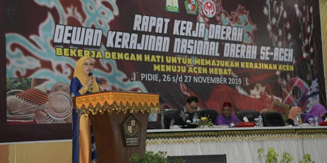 “Kita semua untuk memanfaatkan sebaik-baiknya peluang tersebut dengan berinovasi dan berkarya lebih kreatif untuk menciptakan kriya-kriya unggulan terbaik,” kata Dyah saat penutupan Rakerda Dekranasda Aceh di Auditorium Pidie Convention Center, Rabu (27/11/2019).