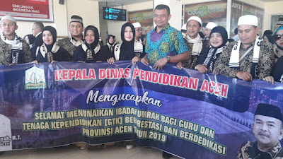 Habanusantara.net, Banda Aceh – Kepala Dinas Pendidikan Aceh, Drs Rachmat Fitri, HD, MPA diwakili Sekretaris Disdik Aceh, Teuku Nara Setia, SE, Ak, M.Si melepas keberangkatan sebanyak 90 jamaah umrah yang terdiri dari Guru dan Tenaga Kependidikan (GTK), Kepala Sekolah dan Pengawas Berprestasi dan Berdedikasi tahun 2019. Pelepasan dan keberangkatan jamaah umrah tersebut dilakukan pada Kamis (12/12/2019 di Bandara Internasional Sultan Iskandar Muda (SIM).