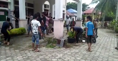 Habanusantara.net, Aceh Besar – Kantor Camat Kecamatan Montasik, Kabupaten Aceh Besar, dirusak massa. Berdasarkan Vidio yang beredar di media sosial, terlihat puluhan orang melakukan perusakan pada kantor pemerintahan Kecamatan Montasik itu, ada yang memecahkan pot bunga, ada juga yang melempar batu ke arah kaca pintu dan jendela kantor tersebut.