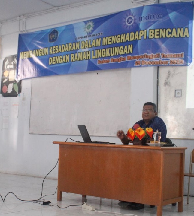 Kuliah yang dihadiri seratusan civitas akademika dan juga anak-anak Panti Asuhan Muhammadiyah Punge itu mengundang pemateri Dr Taqwaddin Husin, Ketua Dewan Pakar Forum Pengurangan Risiko Bencana (FPRB) Aceh, yang juga Koordinator MDMC (Muhammadiyah Disaster Management Center) Aceh.