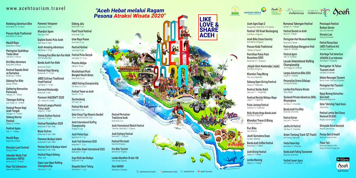Calendar of Event Pariwisata 2020 mengusung tema “Aceh Hebat melalui Ragam Atraksi Pesona Wisata Aceh 2020” tersebut terdapat 107 atraksi wisata yang akan di gelar di seluruh kabupaten dan kota di Aceh.