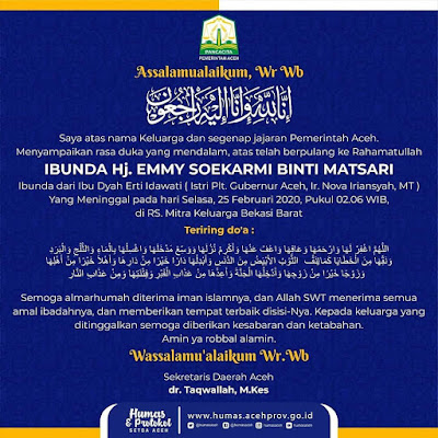 “Innalillahi wainnailaihirajiun. Ibunda Hajjah Emmy Soekarmi binti Matsari, mertua dari Bapak Plt Gubernur meninggal dunia. Kami segenap pegawai di pemerintahan Aceh menyampaikan dukacita. Semoga almarhumah diterima iman Islamnya,” kata Sekretaris Daerah Aceh, dr. Takwallah M.Kes, dalam keterangannya, Selasa 25/2.