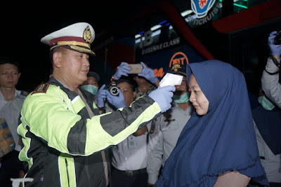 Semua penumpang, awak bus dan sopir Diperiksa satu persatu sebelum berangkat, semua dicek suhu tubuhnya dan memberikan hand sanitaser dan masker.