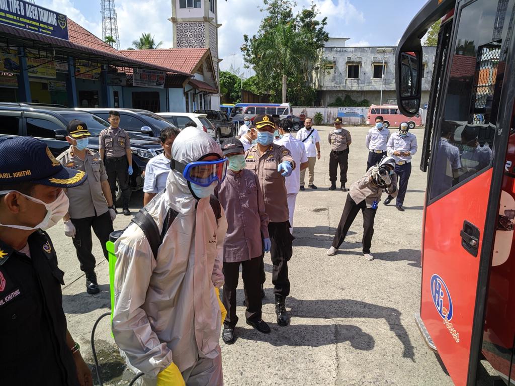 Cegah Penyebaran Virus Covid -19, Forkopimda Aceh Tamiang Lakukan Penyemprotan Desinfektan
