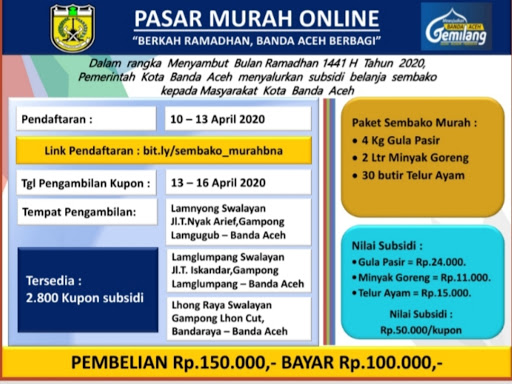 “Dengan sistem ini, masyarakat tidak perlu berdesak-desakan ke pasar murah. Cukup mendaftar lewat link bit.ly/sembako_murahbna untuk mendapatkan kupon, mendapatkan sembako dengan harga murah,” ungkap Aminullah dalam jumpa pers, Jumat (10/4/2020) di pendopo.