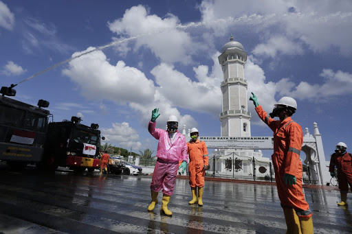Lokasi pertama yang disasar yakni Jalan Tgk Chik Pante Kulu, tepatnya di depan Masjid Raya Baiturrahman. Di sana, Wali Kota Aminullah yang mengenakan baju Hazmat plus atributnya, ikut menyemprot area masjid kebanggaan masyarakat Aceh itu dengan cairan disinfektan.