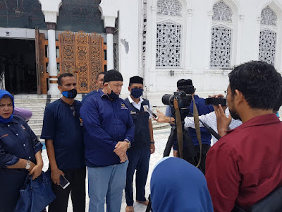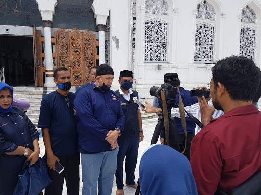 | Sekjen DPD Partai Nasdem yang juga Anggota DPRK Banda Aceh Heri Julius usai membagi-bagi masker kepada para jamaah di Mesjid Raya Baiturrahman, Selasa (14/4/2020) |