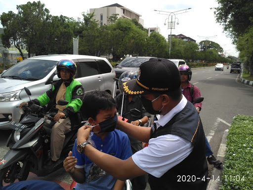| Anggota DPRK Daniel Abdul Wahab Memasang Masker kepeda seroang pengguna jalan di Simpang 5 Banda Aceh, Selasa (14/4/2020) |