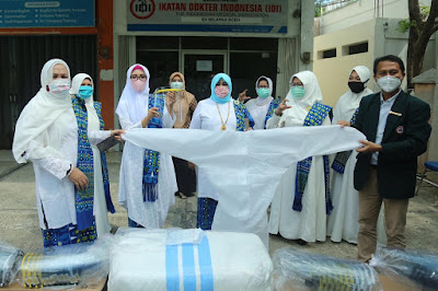 Bantuan 100 helai baju dan 100 face shield itu diterima langsung Ketua IDI Aceh Safrijal Rahman beserta keluarga besar IDI Aceh.