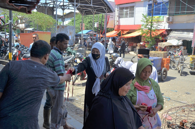 Bersama anggota PKK dan Dekranasda Kota Banda Aceh, Nurmiaty menyisir gang-gang sempit di pasar sayur Peunayong. Ia menyapa Nyak-nyak penjual sayur dan warga yang sedang berbelanja sambil membagi-bagikan masker.