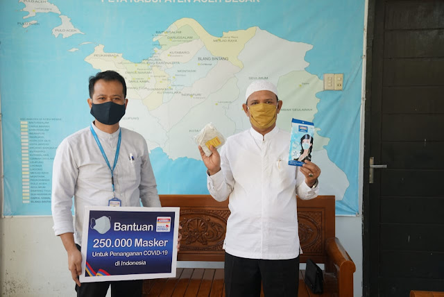 Penyerahan masker kain dan medis dilakukan langsung oleh Deden Mulyadi, License Manager PT. Indomarco Prismatama wilayah Sumatera-Aceh dan diterima Bupati Aceh Besar, Ir H Mawardi Ali.