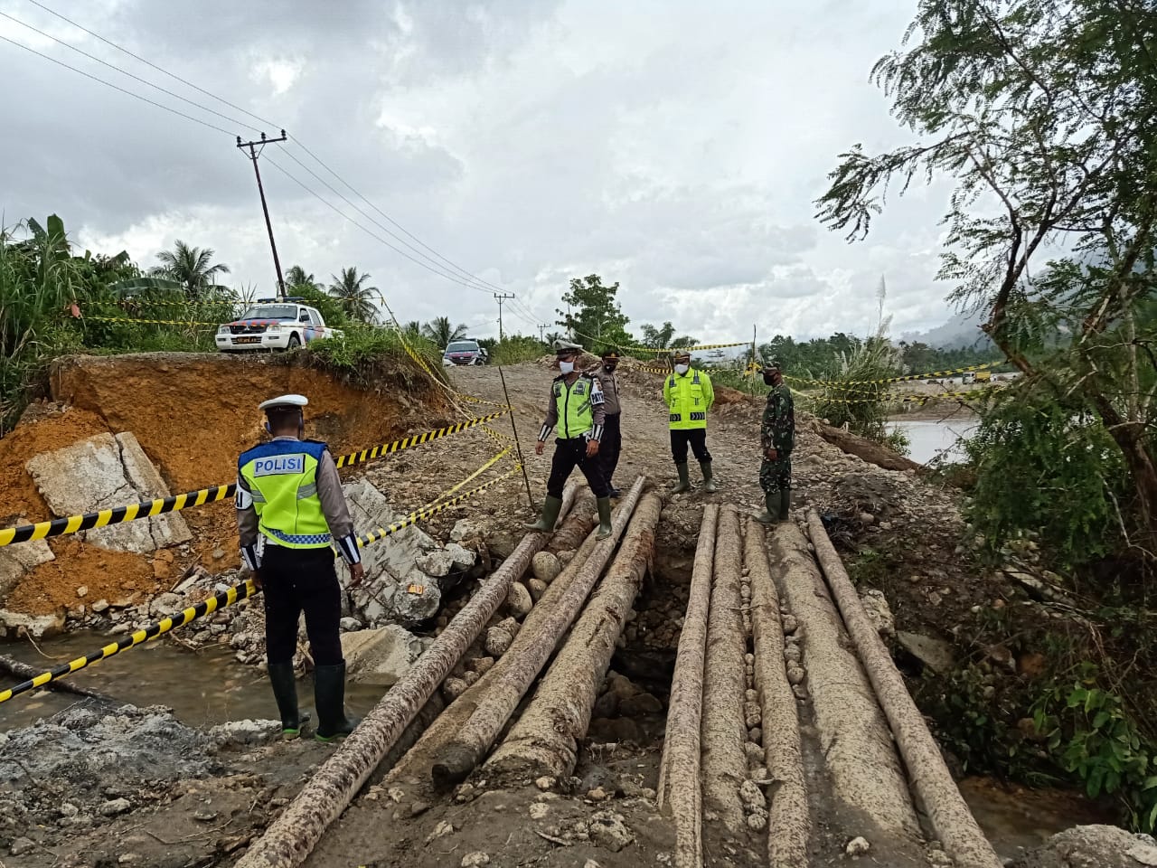 Kemudian Personel Polri bersama stakeholder dan warga masyarakat sekitar membangun kembali jembatan darurat dari batang pohon untuk penanganan sementara