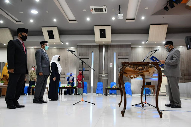 Prosesi pelantikan dilakukan sesuai protokol kesehatan. Seluruh pejabat dan hadirin yang datang diperiksa suhu tubuh, wajib menggunakan masker dan menempati kursi masing-masing yang jaraknya telah diatur petugas.