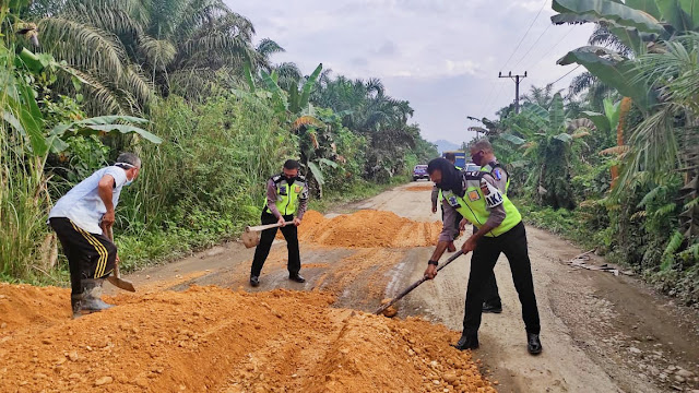 Dikatakannya, para Personel Satlantas bersama masyarakat setempat memperbaiki lobang jalan itu dengan menimbun pasir dan batu.