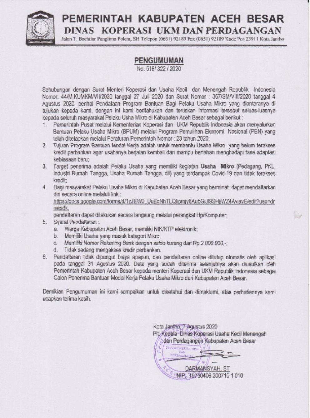 Habanusantara.net, Aceh Besar – Dalam upaya memulihkan ekonomi nasional sebagai dampak Pandemi Covid-19, Dinas Koperasi, Usaha Kecil Menengah dan Perdagangan(Diskopukmdag) Kabupaten Aceh Besar membuka pendaftaran bantuan modal usaha mikro melalui program Pemulihan Ekonomi Nasional (PEN).