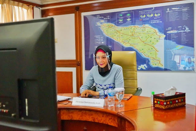 Keterangan Foto: Pelaksana Tugas (Plt), Ketua Dewan Kerajinan Nasional Daerah (Dekranasda) Aceh, Dr. Ir. Dyah Erti Idawati, MT dalam Video Conference terkait acara INACRAFT ke-22, di Jakarta, Rabu 12 Agustus 2021. (Foto: Humas BPPA)