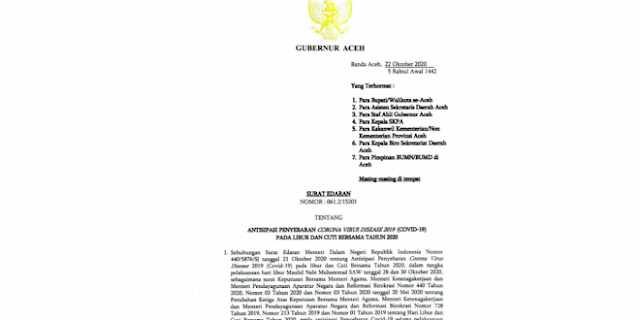 Imbauan itu disampaikan dalam langsung Plt Gubernur Aceh Nova Iriansyah lewat Surat Edaran Nomor 061.2/15021 Tentang Antisipasi Penyebaran Corona Virus Disease 2019 (Covid-19) Pada Libur dan Cuti Bersama Tahun 2020, sekaligus menindaklanjuti Surat Edaran Menteri Dalam Negeri. Edaran itu ditujukan juga kepada seluruh bupati dan wali kota di seluruh Aceh.