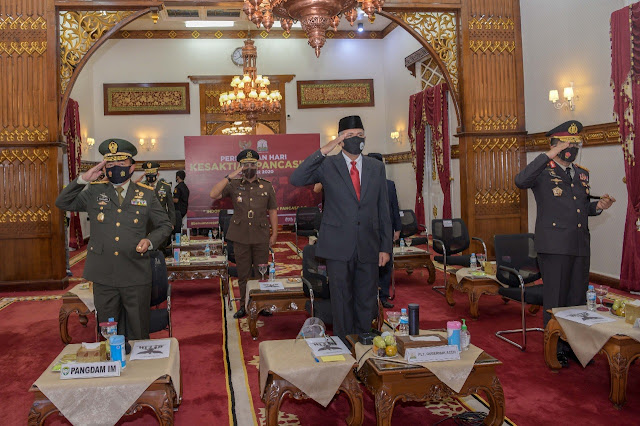 Habanusantara.net, Banda Aceh – Pelaksana Tugas Gubernur Aceh Nova Iriansyah, bersama Pangdam Iskandar Muda Mayjen TNI Hassanudin, Kapolda Aceh Irjen Pol Wahyu Widada, Koordinator Bidang Intelijen Kejati Aceh Farid Rumdana, mengikuti Upacara Peringatan Hari Kesaktian Pancasila secara daring, di ruang tengah Meuligoe Gubernur Aceh, Kamis (1/10/2020) pagi.