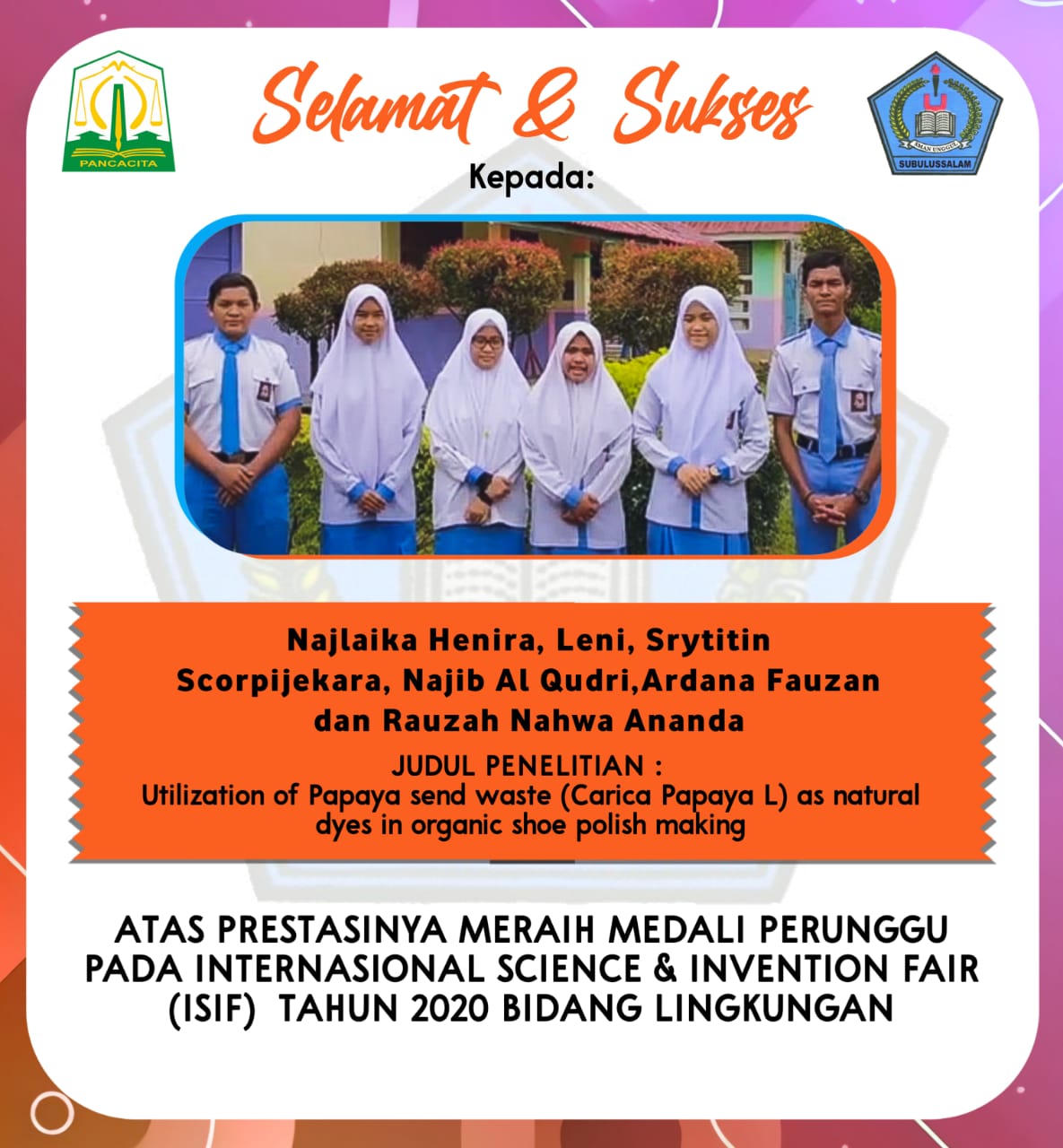 SMA Negeri Unggul Subulussalam Provinsi Aceh dibawah pimpinan Syamsul Bahri S.Pd dan guru pembimbing yaitu Syahri Ramadhan Pohan S.Pd bersama TIM Penelitian SMA Negeri Unggul Subulussalam mendapatkan 5 prestasi dari even ini.
