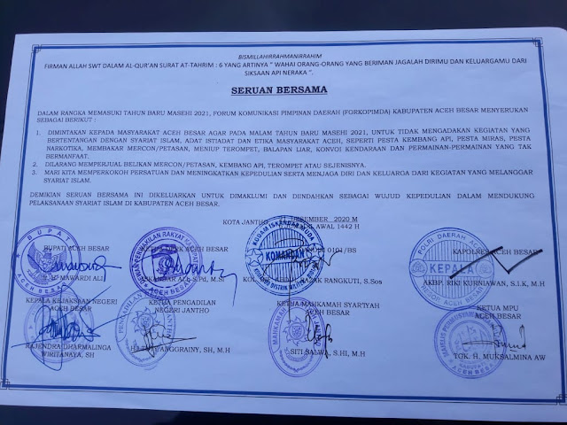 Berikut seruan lengkap larangan merayakan tahun baru di Aceh Besar yang ditandangani Bupati Aceh Besar, Ir H Mawardi Ali bersama unsur Forkopimda lainnya, yakni Ketua DPRK Aceh Besar Iskandar Ali SPd MSi, Kepala Kejaksaan Negeri Aceh Besar Rajendra Dharmalinga Wiritanaya SH, Dandim 0101/BS Kolonel Inf Abdul Razak Rangkuti SSos, dan Kapolres Aceh Besar AKBP Riki Kurniawan SIK MH. Selanjut juga ikut tandatangan Ketua Pengadilan Negeri Jantho Hj Tuty Anggrainy SH M H, Ketua Mahkamah Syar’iyah Aceh Besar Siti Salwa SHI MH, dan Ketua MPU Aceh Besar Tgk H Muksalmina AW.
