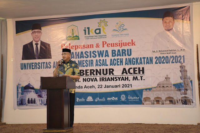 Habanusantara.net, BANDA ACEH – Gubernur Aceh, Nova Iriansyah, melepas 74 orang calon mahasiswa baru asal Aceh ke Mesir untuk menjalani pendidikan tinggi di Universitas Al-Azhar Kairo. Acara penglepasan yang juga dirangkai dengan prosesi peusijuek itu berlangsung di Hotel Grand Aceh Syariah, Banda Aceh, Jumat, (22/1/2021) malam.