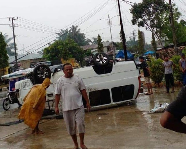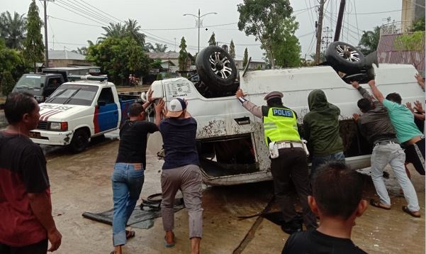 Mobil yang dikemudikan Ruhdi Teksendi (32) warga Desa Bintang Berangun Kecamatan Pintu Rime Gayo, Bener Meriah, terbalik usai berbelok secara tiba-tiba setelah menghindari sepeda motor.