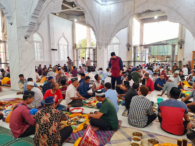 Hidangan aneka masakan, dan juga bermacam jenis kue tersajikan di atas talam yang diberi penutup (tutup saji) dari rumah warga dibawa ke masjid untuk santapan menu berbuka puasa bersama pada kenduri Nuzulul Quran di setiap Ramadhan.