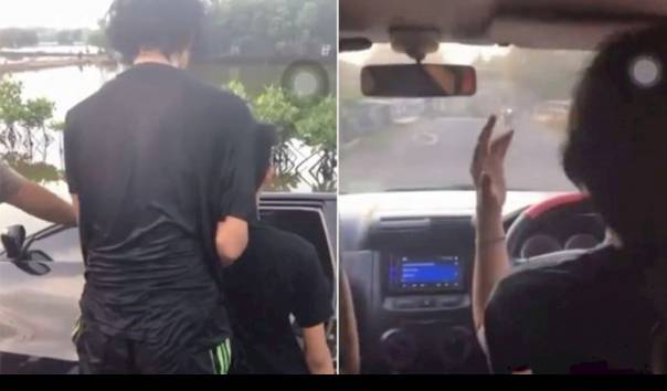 Satu di antara mereka adalah yang mengemudikan mobil, sementara satu lagi duduk di bangku sebelah sopir. Video tersebut diduga diambil oleh salah satu teman mereka yang duduk di bangku belakang.