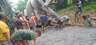 Semangat 45, Warga dan Satgas TMMD Kembali Berjibaku Cor Beton Jalan