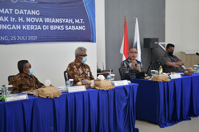 Habanusantara.net, SABANG – Segenap jajaran manajemen Badan Pengusahaan Kawasan Sabang (BPKS) diminta membangun soliditas organisasi dengan meningkatkan kekompakan dan kerjasama internal serta eksternal, sehingga target untuk melaksanakan pengembangan Kawasan Sabang (Kota Sabang dan Pulo Aceh, Aceh Besar) sebagai tempat investasi dan tujuan pariwisata dapat terwujud dengan baik dan sesuai ekspektasi . “Membangun Kawasan Sabang tidak boleh berjalan sendiri-sendiri, namun terintegrasi secara utuh,” kata Nova saat menggelar pertemuan dengan Kepala, Dewan Pengawas dan pejabat struktural lingkup BPKS, di Aula Kantor BPKS, Minggu, 25 Juli 2021.