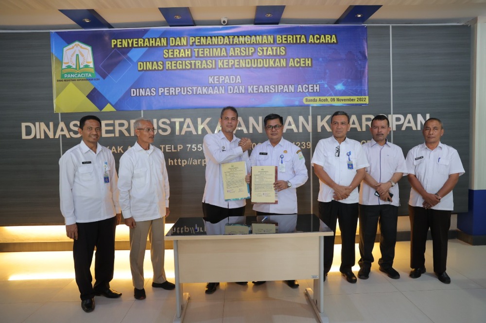 Habanusantara.net, Dinas Perpustakaan dan Kearsipan Aceh terima arsip statis Dinas Registrasi Kependukan Aceh, Rabu (10/11/2022). Serah terima arsip yang dilakukan Kadis DRKA, Drs. Teuku Syarbaini, M,Si, kepada Kadis Perpustakaan dan Kearsipan Aceh, Dr Edi Yandra STP MSP, di kantor Dinas Perpustaaan dan Kearsipan Aceh, Banda Aceh.