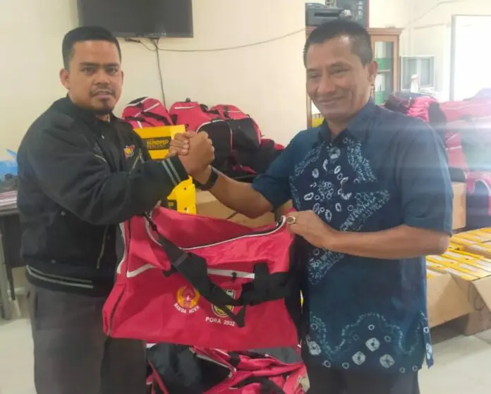 Perlengkapan tersebut langsung diserahkan oleh Hamdani Basyah secara simbolis kepada masing-masing cabor di Kantor KONI, Komplek Taman Putroe Phang, Kamis (1/12/2022).