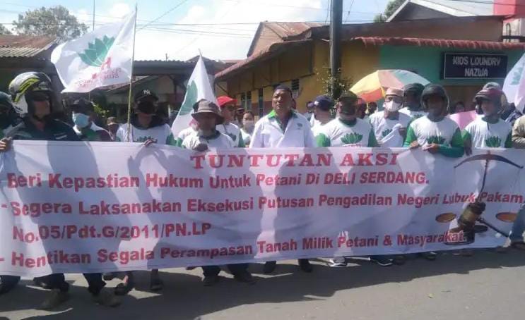 Massa mendesak agar PN Lubuk Pakam segera laksanakan Eksekusi Putusan Pengadilan Negeri Lubuk Pakam No.05 Pdt.G/2011/PN.Lbp sehingga memberi kepastian hukum bagi petani.