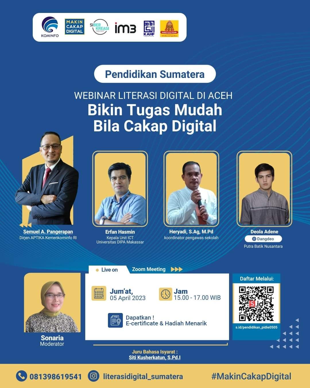 Kegiatan webinar literasi digital yang diselenggarakan oleh Kementerian Komunikasi dan Informatika (Kemenkominfo) di lingkungan pendidikan merupakan salah satu upaya dalam mempercepat transformasi digital di sektor pendidikan menuju Indonesia #MakinCakapDigital.