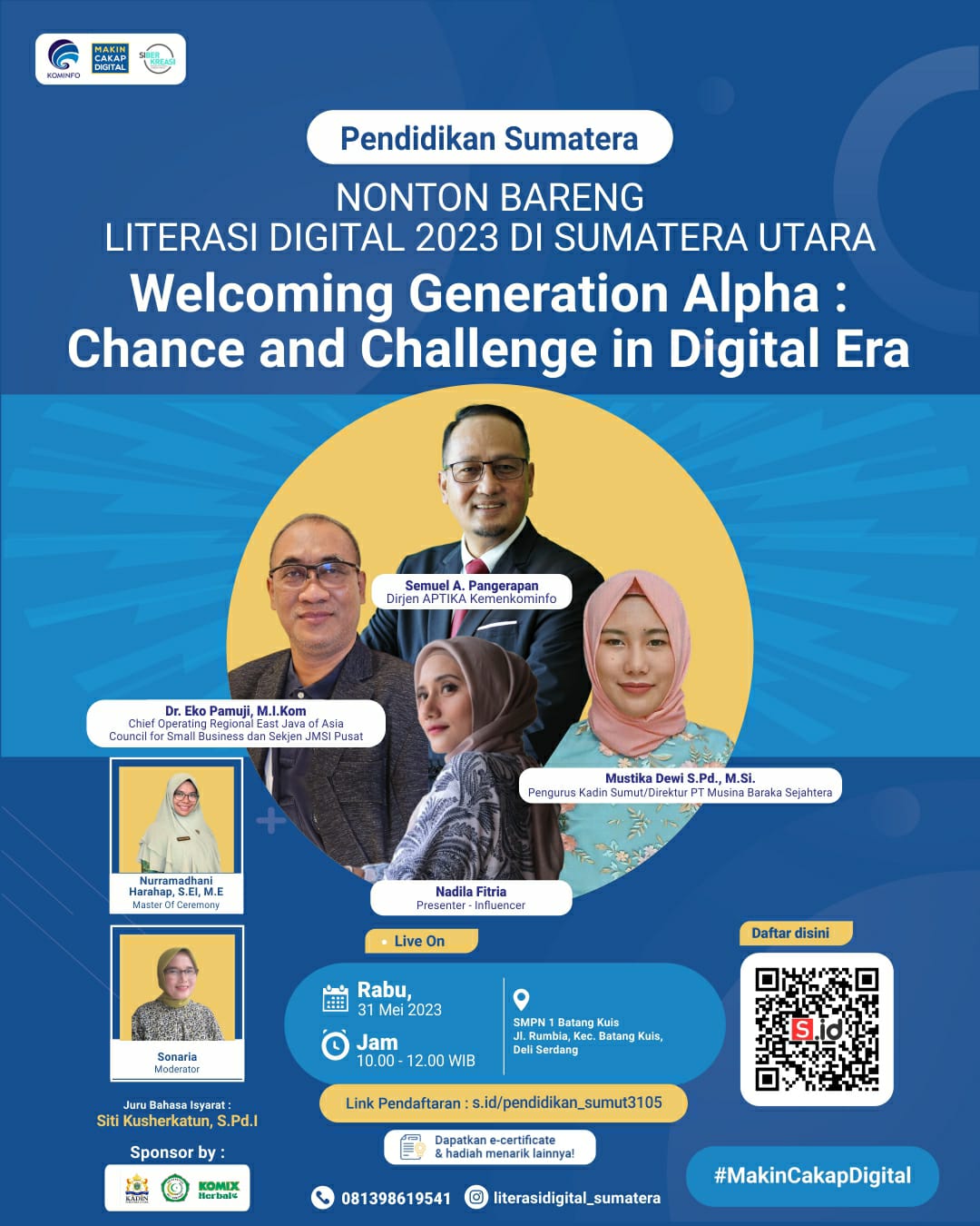 Kegiatan secara nonton bareng (nobar) ini mengangkat tema “Welcoming Generation Alpha : Chance and Challenge in Digital Era” yang digelar di SMPN 1 Batang Kuis, Kabupaten Deli Serdang, Provinsi Sumatera Utara, Rabu (31/5/2023).